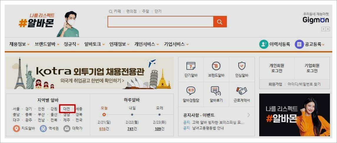화면으로 접속을 하시게 되었다고 한다면 가장 우측에 지역별 알바가 보일 거예요. 여기에서 대전 알바몬으로 접속을 하시려면 대전 골라 주시면 되어지셔요.