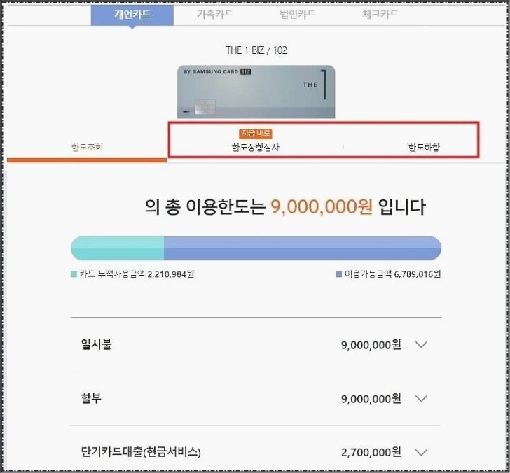 Login을 하면 위에 처럼 화면이 보일건데요. 삼성카드 한도조회를 해 볼 수 있을거예요. 근래 적용이 되어 있는 카드 한도가 나타나고 일시불이나 할부 단기 카드대출 등에 관련해서도 소개가 나오게 된답니다.
