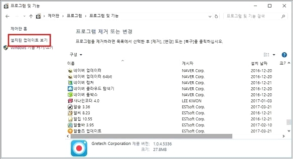 그러면 이렇게 인스톨 된 목록이 나오게 될겁니다. 이 화면에서 상단에 좌측에 보시면 <설치된 업데이트 보기>를 눌러주셔야 인터넷 익스프롤러가 나오게 될겁니다. 무조건 나오지 않습니다.